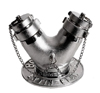Toma para bombero, fabricada en bronce cromado con dos entrada para alimentación de agua a la red contra incendios. Con tapónes y cadena.